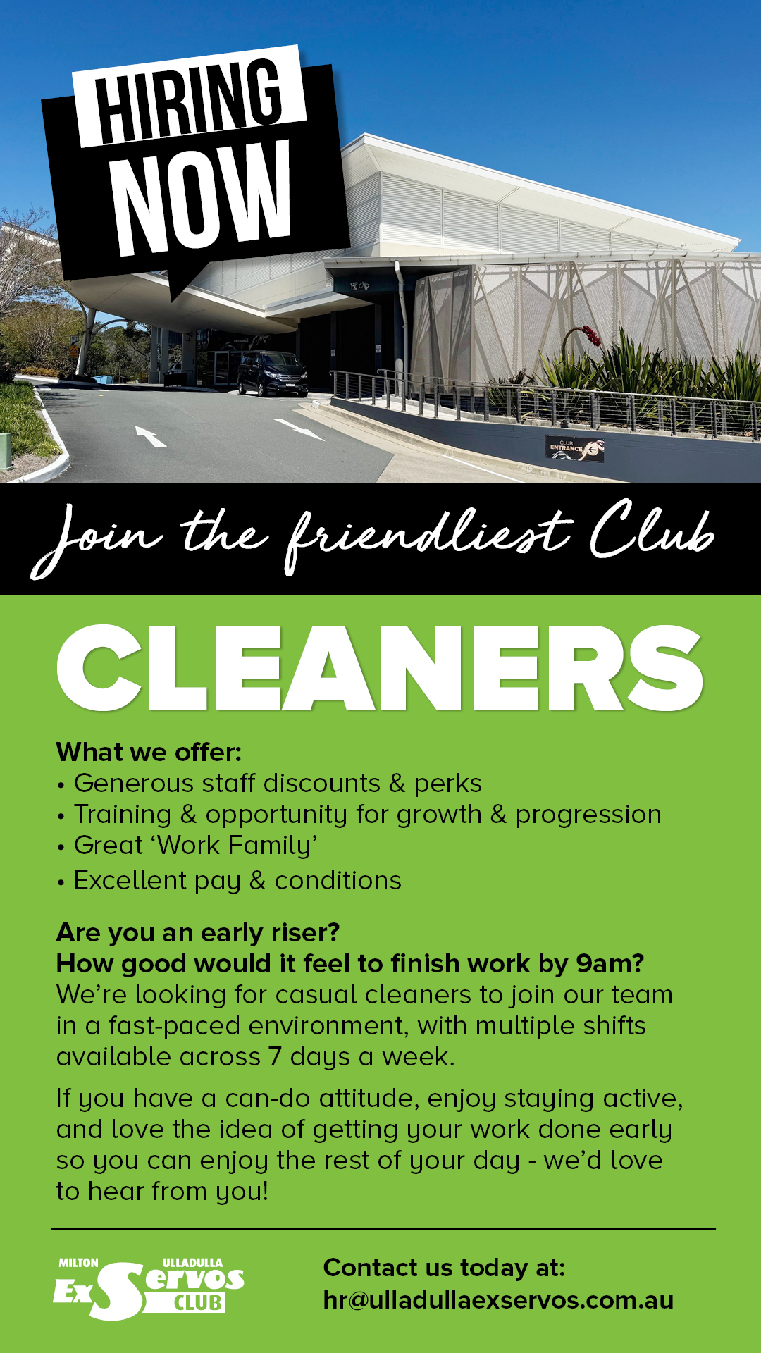 Join the friendliest ClubWhat we offer: Generous staff discounts & perks, Training & opportunity for growth & progression, Great ‘Work Family’, Excellent pay & conditionsWhat we are looking for: Bar & Gaming Attendant, Restaurant staff, Cleaners, Plan B Passenger transport drivers, Full-time Qualified Chefs. If this sounds like you, contact: hr@ulladullaexservos.com.au